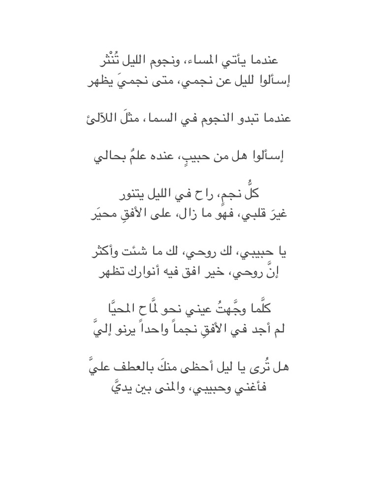 عندما يأتي المساء ونجوم الليل تنثر أسأل الليل عن نجمي متى نجمي يظهر