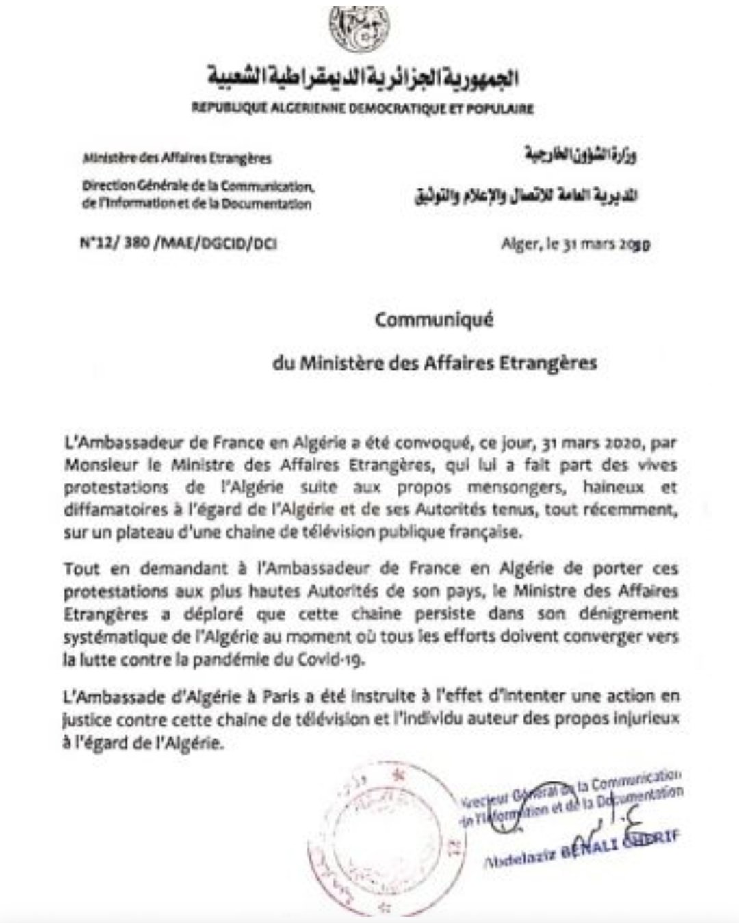 Adil On Twitter وزارة الخارجية سفارة الجزائر في باريس ستتابع قناة عمومية فرنسية قضائيا بشأن تصريحاتها المسيئة في حق البلاد البيان لا يسمي القناة لكنه بكل تأكيد يخص فرانس 24
