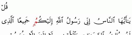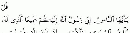 ق ل ي ا أ ي ه ا الن اس إ ن ي ر س ول الل ه إ ل ي ك م ج م يع ا ال ذ ي ل ه م ل ك الس م او ات و ال أ ر ض ل ا إ ل ه إ ل ا ه و ي ح ي ي و ي م يت ف آم ن وا ب الل ه و ر س ول ه الن ب ي ال أ م ي ال ذ ي ي ؤ م ن ب الل ه و ك ل م ات ه