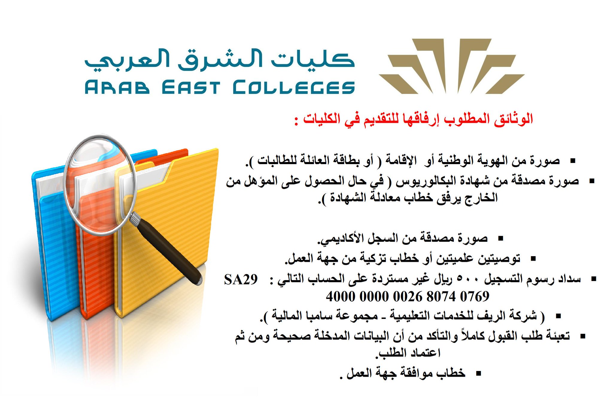 كليات الشرق العربي. Designed and developed by. إعلان عن آلية الدراسة بالكليات خلال الفصل الأول من العام الجامعي ١٤٤٢هـ. المساهمة في بلورة الهوية الشرعية والقانونية للملكة من خلال إعداد بحوث ودراسات متخصصة في هذا المجال. 53354 الرياض 11583المملكة العربية السعودية info arabeast edu s.