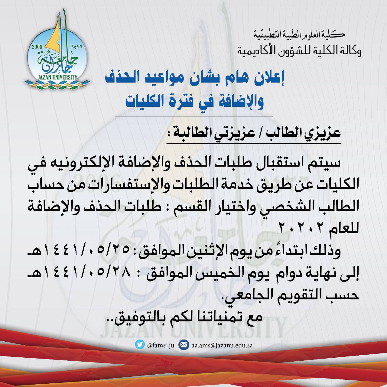 كلية العلوم الطبية التطبيقية جامعة جازان On Twitter بدء إستقبال طلبات الحذف والإضافة للفصل الدراسي ٢٠٢٠٢ من خلال ايقونة الطلبات والإستفسارات طلبات الحذف والاضافة للفصل الدراسي ٢٠٢٠٢ Https T Co Hvavfiua2c